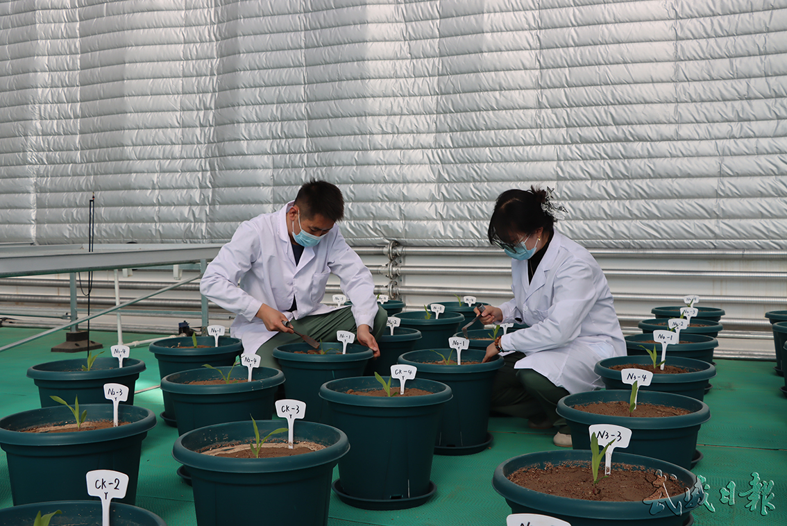 武威金仓生物研发人员正在智能玻璃温室内做实验