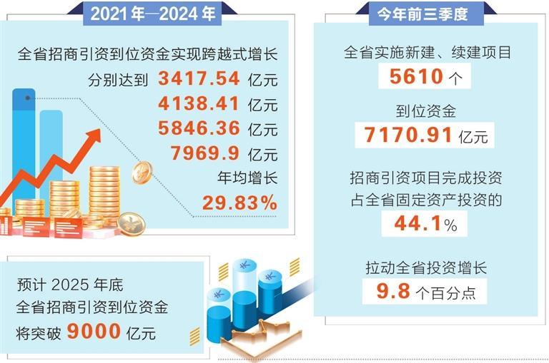 据统计,2021年—2024年,全省招商引资到位资金实现跨越式增长,分别达到3417.54亿元、4138.41亿元、5846.36亿元、7969.9亿元,年均增长29.83%。今年前三季度,全省实施新建、续建项目5610个,到位资金7170.91亿元,招商引资项目完成投资占全省固定资产投资的44.1%,拉动全省投资增长9.8个百分点。预计2025年底,全省招商引资到位资金将突破9000亿元。(记者曹立萍)
