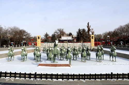 隆冬时节,武威雷台古朴幽静,冬韵悠长。铜奔马仪仗俑列阵肃立,天马踏燕凝千年雄姿,尽显汉韵威仪。景区内红灯高悬,满是迎春纳福的喜庆气息