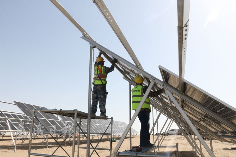 在三峡能源武威20万千瓦光伏治沙项目建设现场,打桩、支架、组建等工作正如火如荼开展,工人们手抬肩扛,将一块块光伏板组装在一起,一派热火朝天的景象。