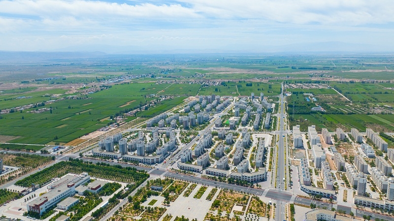 古浪县绿洲小城镇航拍。绿洲小城镇安置南部山区11个乡镇4790户1.77万搬迁群众,建成中小学各1所、幼儿园2所、医院1所、卫生室12所,完成天然气入户1500户,水电路网实现全覆盖。同时,配套建成农贸市场、中心广场各1处,开通运行公交班线,极大地方便了群众生产生活。 (记者甘曜毓 高德强 )