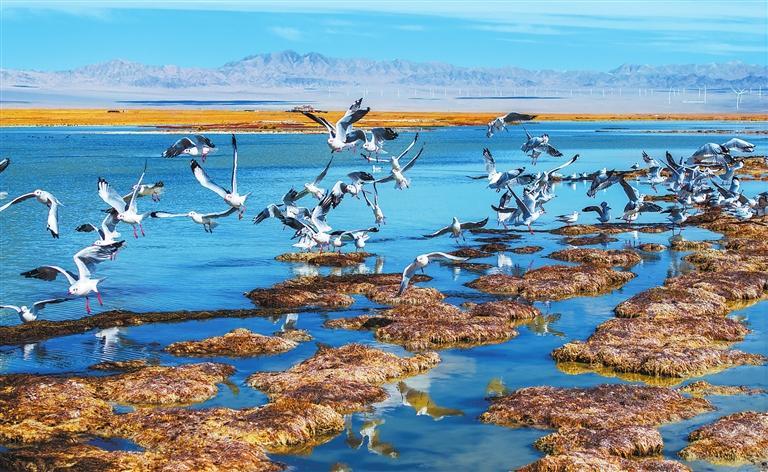 成群的鸟类聚集在阿克塞县境内的海子草原。(通讯员高宏善)