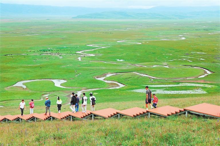 游人在玛曲县阿万仓黄河湿地公园游玩。(记者田蹊)
