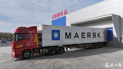 3月10日,在武威泽源翔食品有限公司出货口,运输车辆正在等待货物装车。该公司主营鲜肉冷链及精细加工,拥有 3 台机器人屠宰线,目前产品销售遍及甘肃、四川、青海、内蒙古、西藏等地。(记者高德强)