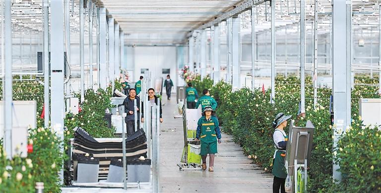 1月28日,兰州新区现代农业示范园花卉产业基地内,工人忙着采摘、分拣、包装鲜切玫瑰。(通讯员侯崇慧)