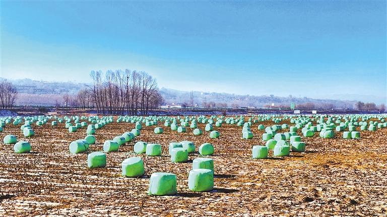 广河县广通河沿线广袤农田里,一包包饲草“包裹”形成一道美丽的风景,通过牛羊过腹堆肥还田,发展种养循环绿色农业……