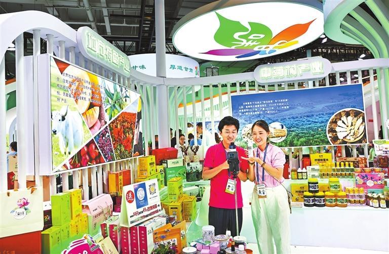 兰洽会甘味农产品馆主播正在直播带货。《甘肃省甘味农产品品牌培育管理条例》的施行,让甘味品牌培育管理迈上法治化轨道。(记者田蹊)