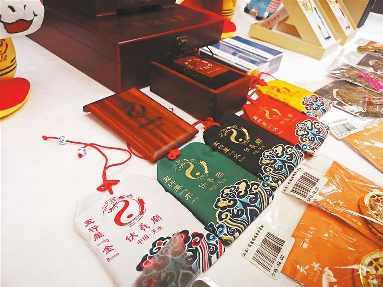 天水伏羲庙的文创产品河洛挂牌也很受欢迎。“挂牌是用天水伏羲庙的侧柏制作的,挂牌正面是太极八卦图,背面是河图洛书,侧面是北斗七星,十分精美,寓意美好。”天水市博物馆文化产业部工作人员杨萱慧说,“我们还特意为挂牌制作了5种颜色的收纳包,分别代表‘金、木、水、火、土’,大家可以按自己喜好选购收纳包来收纳河洛挂牌。”